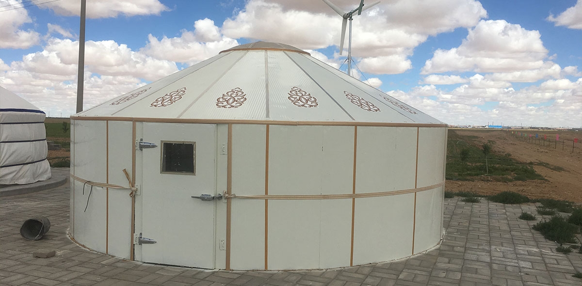 保溫蒙古包是一種新型節(jié)能組合式蒙古包,由150mm厚聚氨脂保溫材料模壓成型。采用組合式結(jié)構(gòu),無龍骨和支架,天窗、頂板和墻面均為預制結(jié)構(gòu),實現(xiàn)冬天保暖、夏天隔熱涼爽的效果,同時具有無毒、隔熱、抗大風、防震等特點。該蒙古包安裝方便快捷,可有效地縮短建設工期,施工難度小,便于拆裝和搬遷運輸。保溫、隔熱、抗風各項指標明顯優(yōu)于傳統(tǒng)蒙古包,其保溫效果是普通磚瓦建筑的40倍,適合高寒野外和草原牧區(qū)等使用;既可作為家庭住房單獨使用,也可以用于野外極地作業(yè)、軍營或旅游景點、娛樂、餐飲等場所使用。該蒙古包適合配以太陽能光伏和風力發(fā)電機實現(xiàn)采暖、降溫的零碳排放。